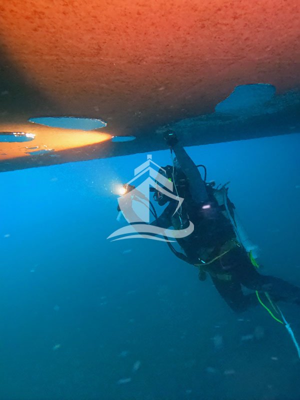 Divers inspect the hull to assess the level and type of marine growth.