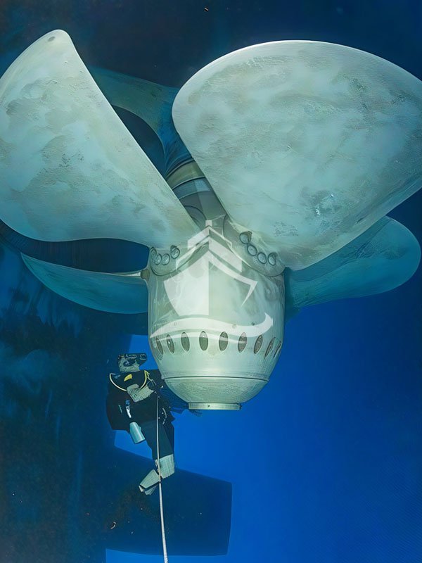 The propeller blades are cleaned of marine growth and polished to a smooth, mirror-like finish.